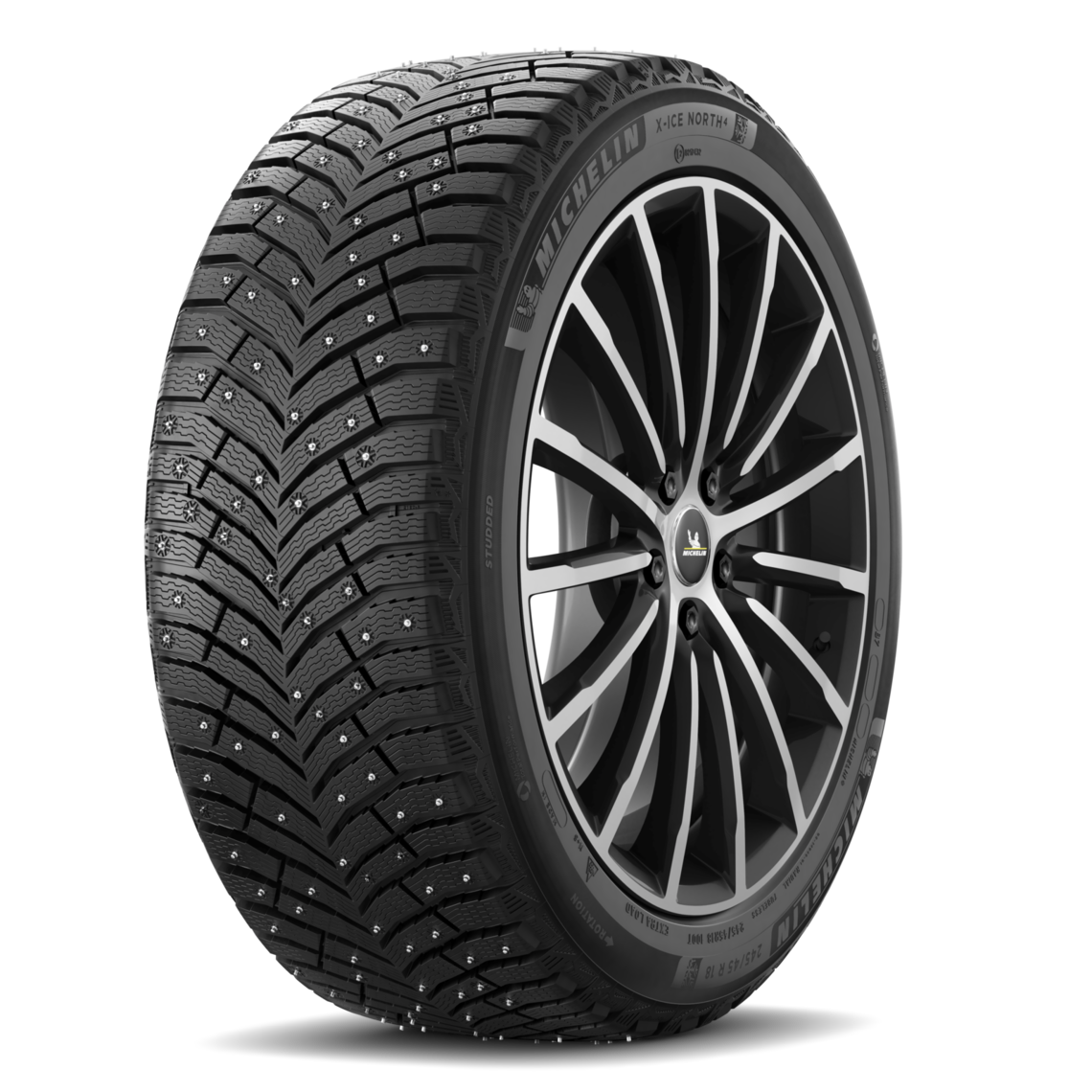 Зимова гума Michelin X-Ice North 4 (Мішлен Ікс Айс Норд 4) – це шипована модель, призначена для легкового транспорту. Автошини з'явилися у зимовій лінійці виробника у 2018 році. Шини North 4 прийшли на зміну автогуми Michelin X-Ice North 3, і на відміну від неї демонструють найкраще зчеплення на слизьких дорогах, прохідність глибокого та пухкого снігу, підвищену стійкість до зношування. Гума протектора має рекордну кількість (понад 250 штук) шипів, що зумовлює високий рівень безпеки під час руху по укоченому снігу та ожеледиці. Блоки протектора оснащені численними тривимірними зигзагоподібними ламелями, які працюють на посилення зчіпних і гальмівних властивостей автошини. Вони забезпечують ефективне та оперативне гальмування. А їхній тандем із потужними блоками плечових зон дозволив скоротити гальмівний шлях на 7%, порівняно з попередницею. Гострі ґрунтозачепи на плечових шашках підвищили прохідність та продуктивність. Велика ламелізація та ошипування значно збільшила швидкість розгону та усунула пробуксовки на слизьких дорожніх поверхнях. Інноваційна технологія Smart Stud, застосована у виробництві та розміщенні шипів проти ковзання, забезпечує їх надійну фіксацію у протекторних блоках. За рахунок конічної форми та особливої будови виключено їх випадання протягом усього терміну експлуатації та покращено зачіпну здатність. Посадочні гнізда шипів оснащені спеціальними «колодцями», в які збирається крижана крихта і під час руху видаляється з цієї зони. Автошини при зіткненні з гострим камінням та краями вибоїн на дорожній поверхні амортизують. Таким чином, протектор оберігається від пошкоджень і виключає можливість розгерметизації виробу. Ця властивість забезпечується завдяки запатентованій технології виробника IronFlex. Дренажна система автошини чудово справляється з евакуацією води та талого снігу з контактної плями. Її пропускна спроможність значно збільшена за рахунок зміни кута, під яким розташовані канавки. Результатом такого конструкторського рішення стало більш ефективне, ніж у попередньої моделі, самоочищення протектора від надлишків снігу та високий опір акваплануванню та слешингу. Зимові автошини Мішлен Ікс Айс Норд 4 – це: функціональне обшипування; першокласне зчеплення на льоду; запобігання слішпланнінгу; потужне та оперативне гальмування; морозостійка гума; безпека руху; великий їздовий ресурс. Склад, з якого виготовлена гума, також зазнав деяких змін. У нього включена традиційна силіка, адгезійні присадки та нові компоненти. Завдяки удосконаленню компаунду суттєво покращено експлуатаційні властивості моделі. Гума стала набагато міцнішою та еластичнішою, підвищена її зносостійкість та зчіпні якості. Вона чудово виносить дуже низьку температуру, що дозволяє зберігати відмінний контакт із поверхнею дороги. Стійкість до стирання збільшила робочий ресурс на 14% порівняно з третьою. Компанія Michelin - всесвітньо відомий виробник шинної продукції. Вироби бренду користуються великою популярністю серед споживачів і часто використовуються компаніями, що виготовляють автомобілі, базової комплектації своїх моделей. Шини бренду забезпечують безпечний рух у будь-який сезон року, відрізняються надійністю, відмінними їздовими властивостями та великим експлуатаційним ресурсом. Виробник суттєво покращив розташування шипа у гумі.